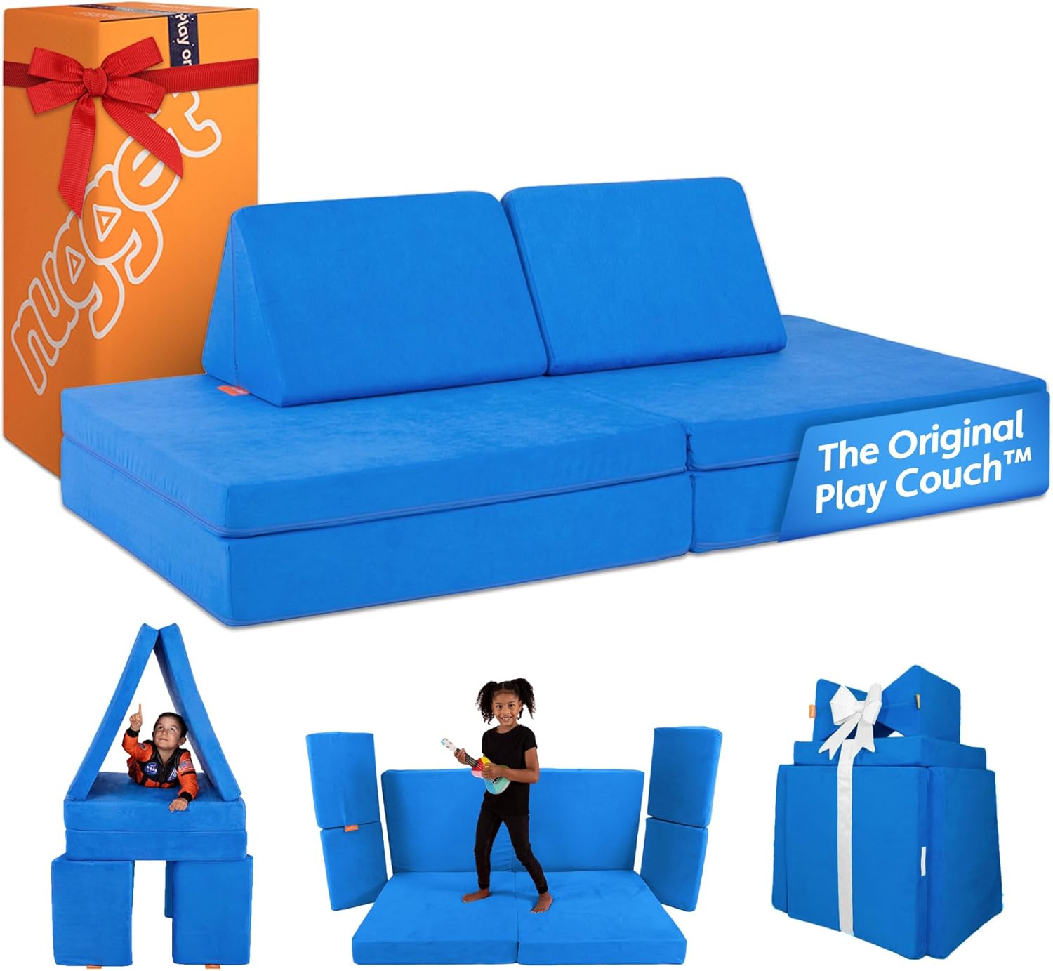 The Nugget (and its circular cousin, the Chunk) are soft, modular play-couch pieces—rectangles, wedges, and arches—that kids can rearrange into forts, obstacle courses, reading nooks, slides…pretty much anything their imagination comes up with. The Chunk folds into a neat ottoman when not in use, while the Nugget is more of a permanent playroom fixture. They’re soft, sturdy, and built for climbing, stacking, tumbling, and pretending.