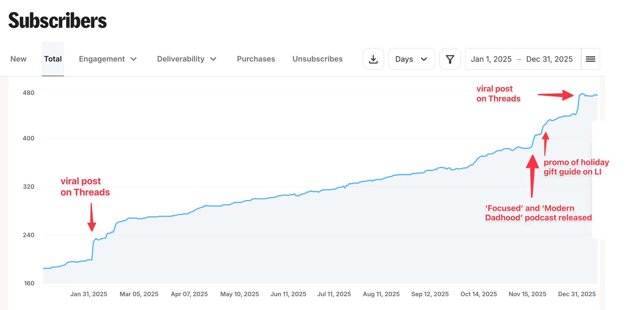 I landed at about 470 subscribers by the end of the year. A lot of growth came from recommendations of other creators. Some growth came from being a guest on a few fatherhood or productivity podcasts.
