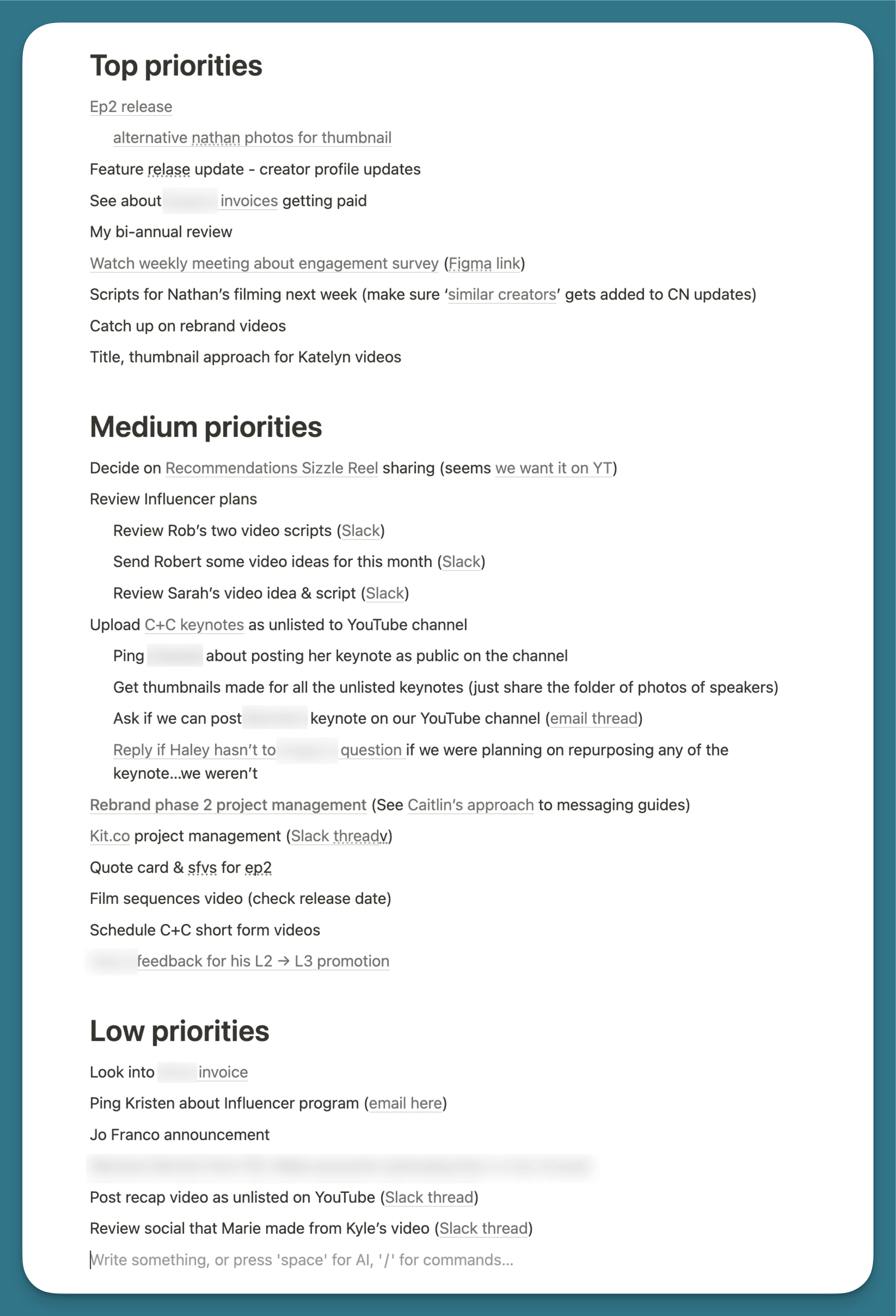 Then to make it a lot easier to find those tasks when I need to I always leave a link to either the email or the Slack thread or the project management link with that task so when I get to it I can click out to wherever I need to go.